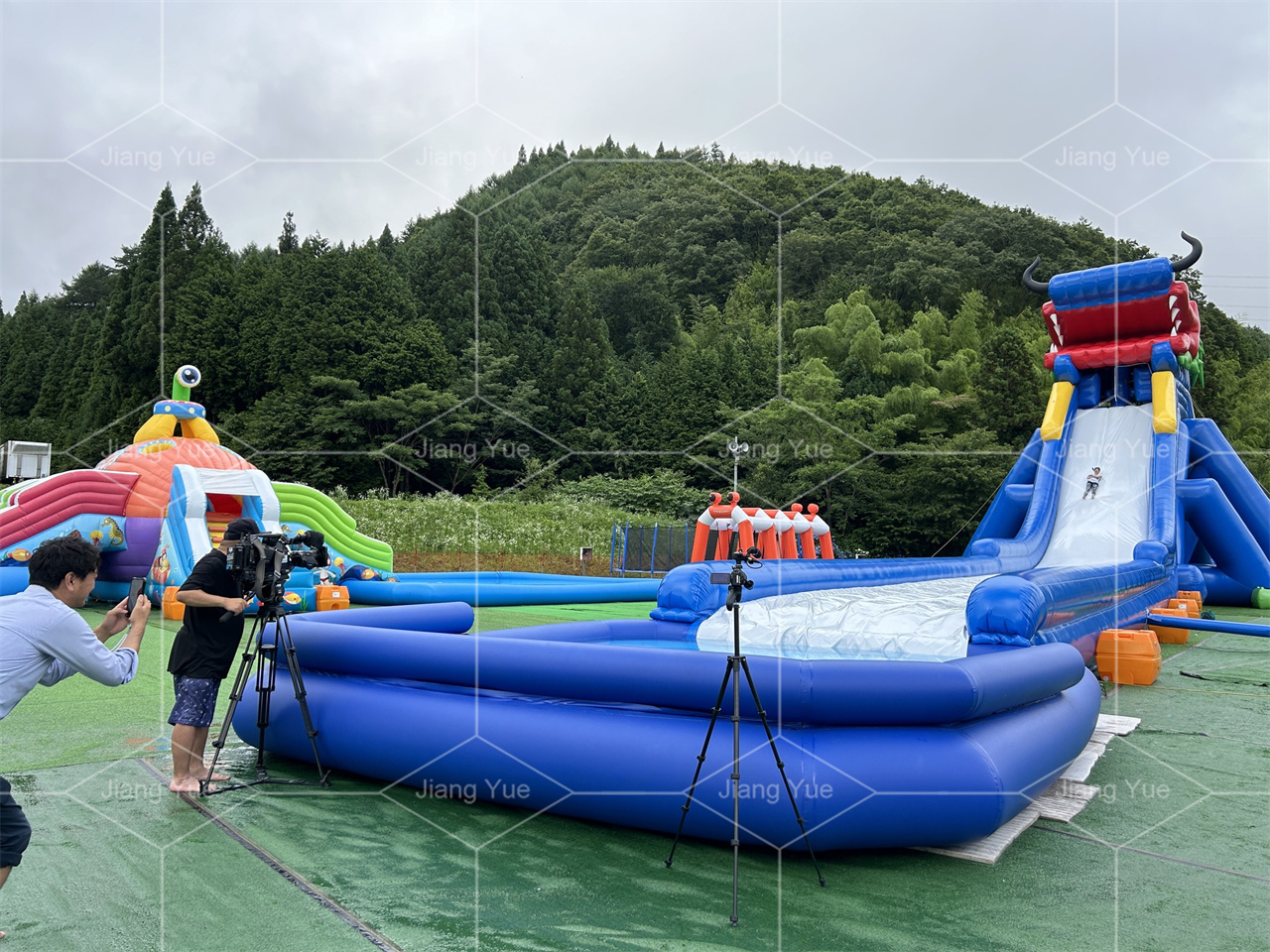 • Ski resorts often boast undulating terrain, which provides a wealth of variation in the layout of inflatable water parks. Various water slides can be set up with different height differences to increase the excitement and interest of play. For example, a spiral water slide is set up from the higher slopes, allowing visitors to experience the thrill of high-speed downhill.